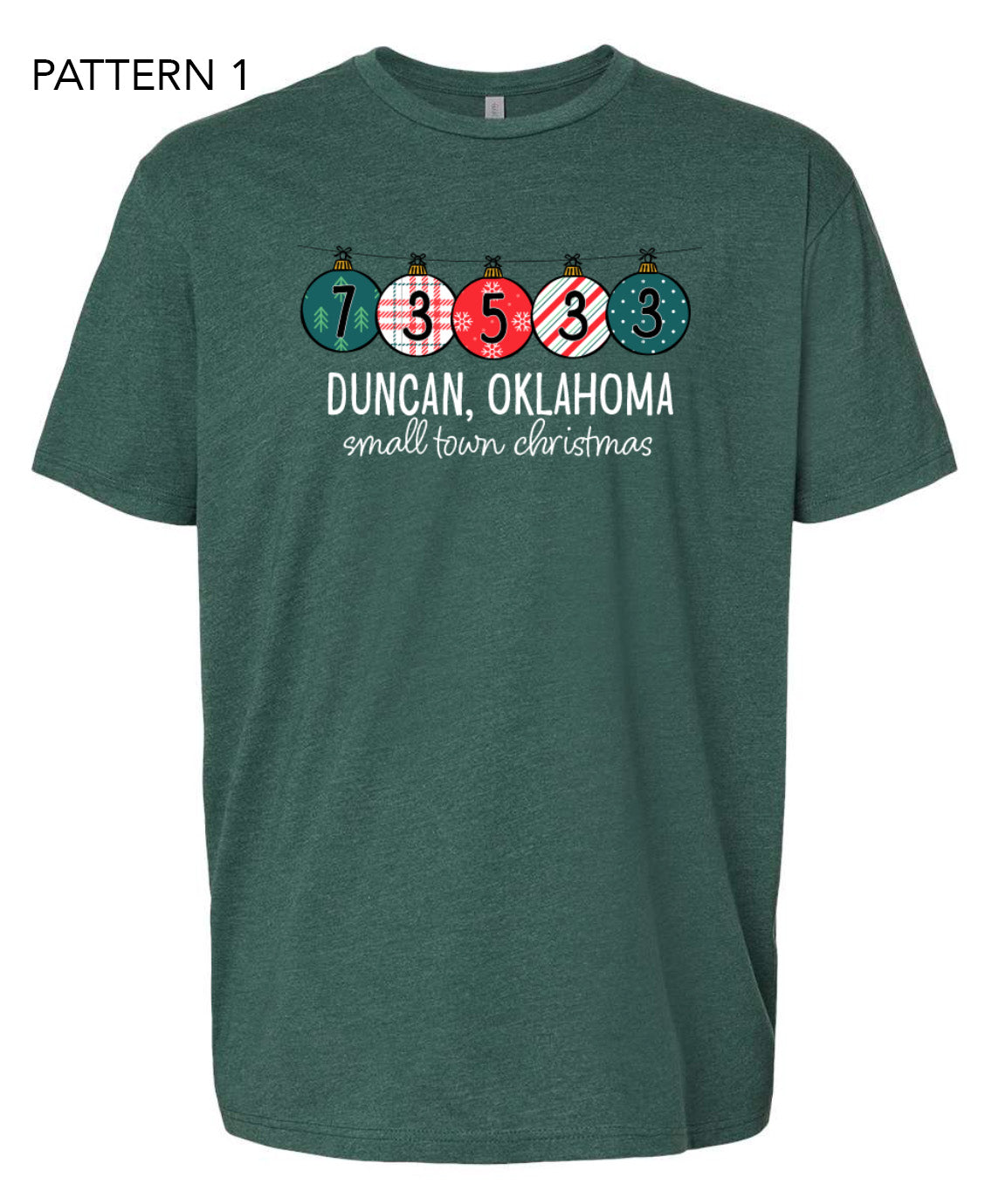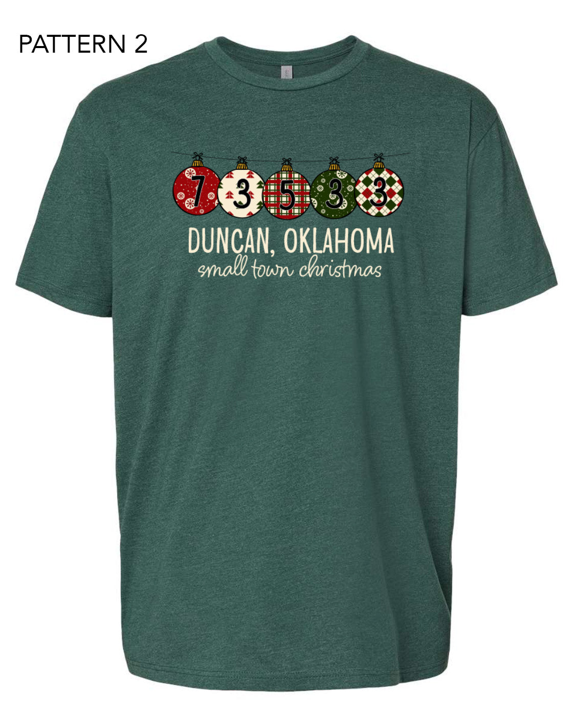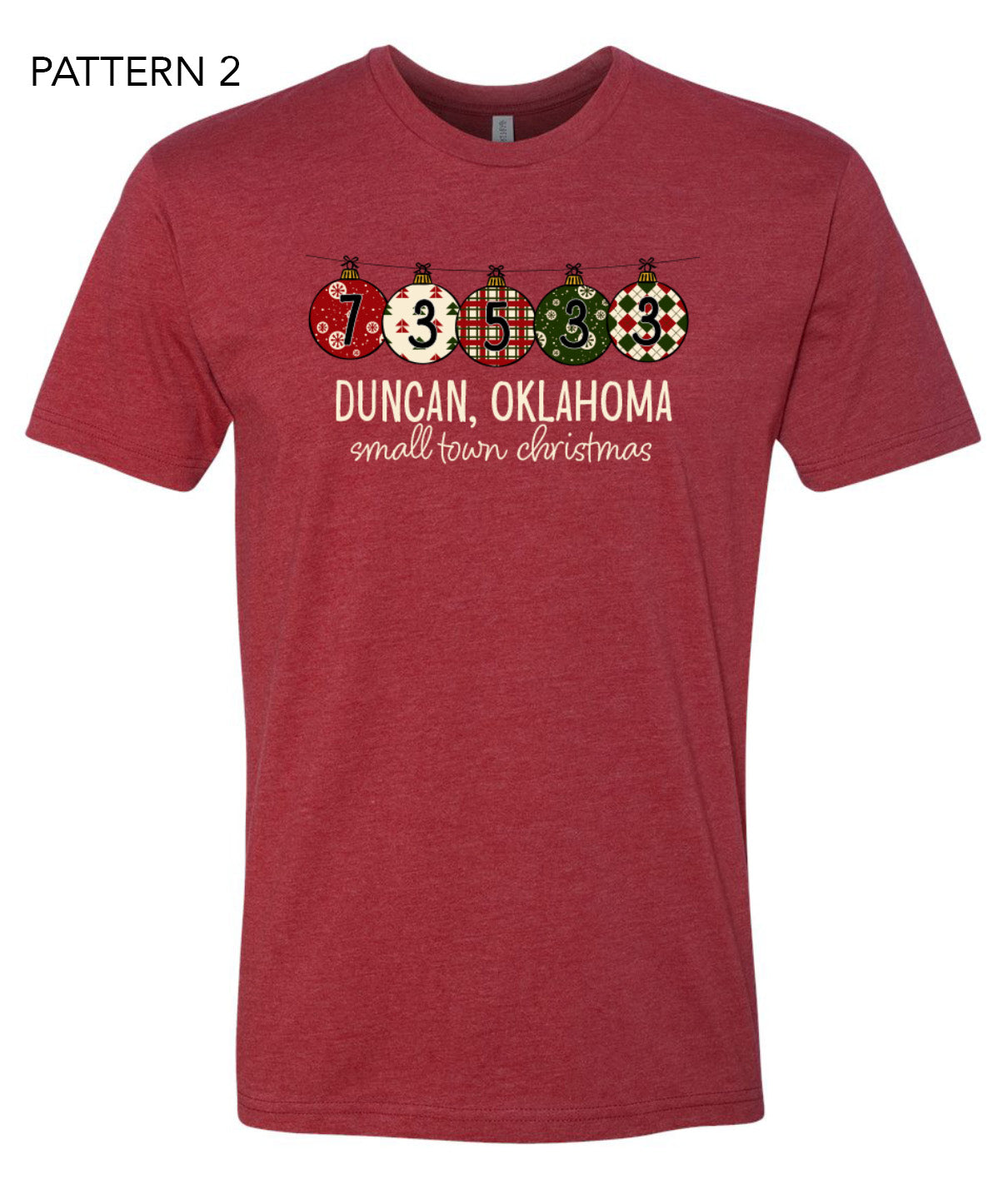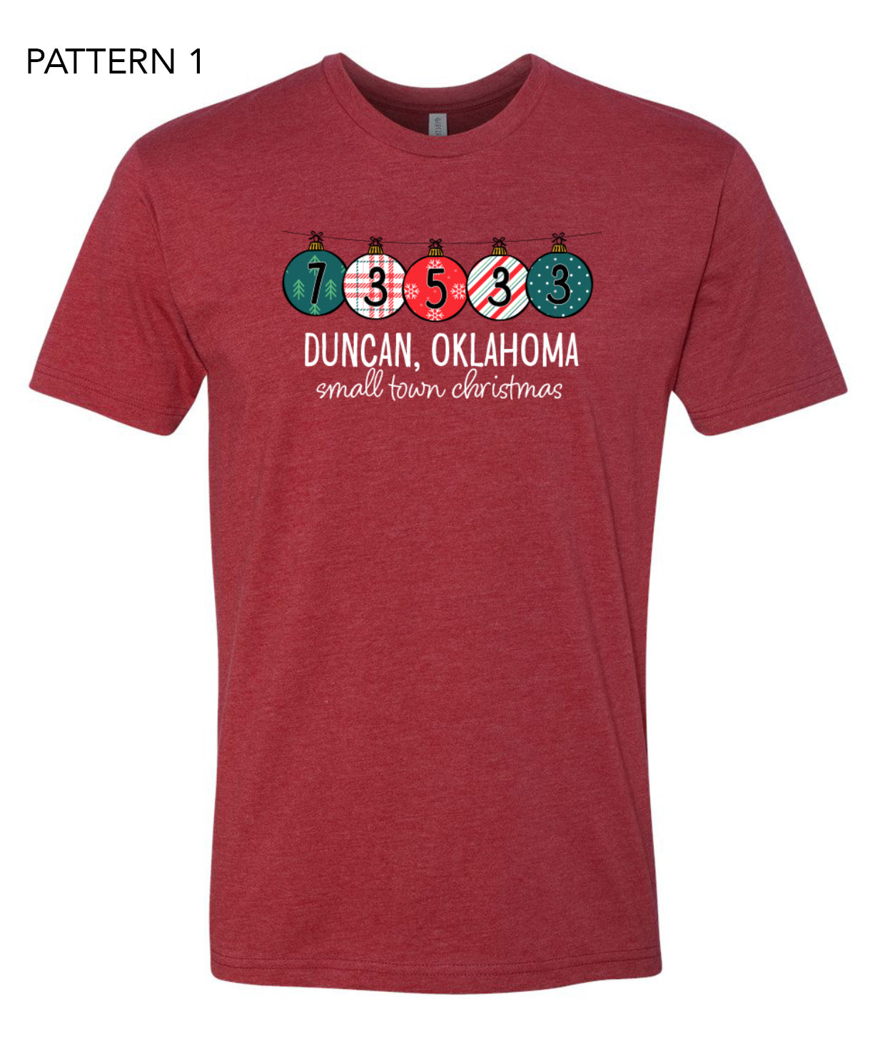 Celebrate the holiday season in hometown style with our Small Town Christmas tee! Available in two festive ornament pattern options, this shirt can be customized with your own town and state for a personal touch. Perfect for parades, local events, or simply showing your small-town pride this Christmas!