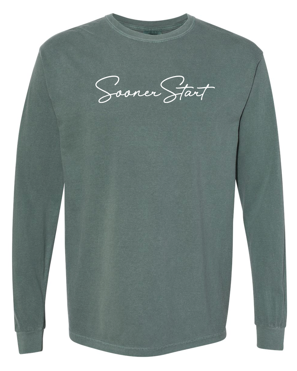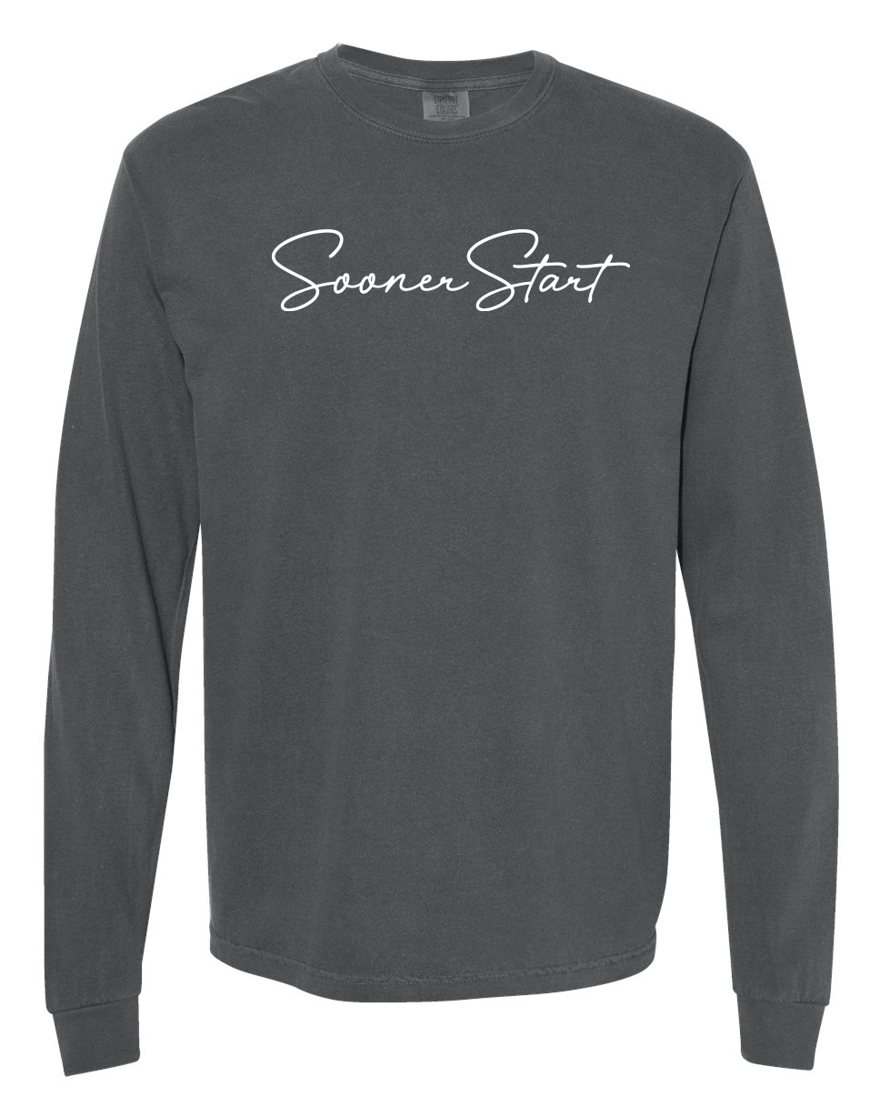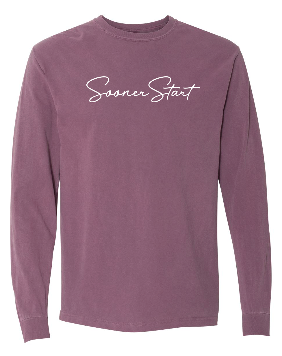 Comfort Colors Unisex Garment-Dyed Heavyweight Long Sleeve T-Shirt with screen printed "SoonerStart" in script font.