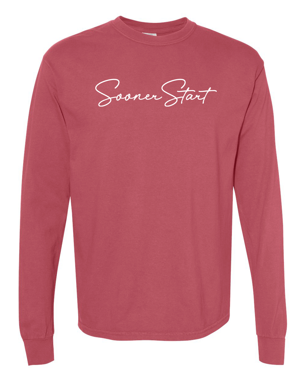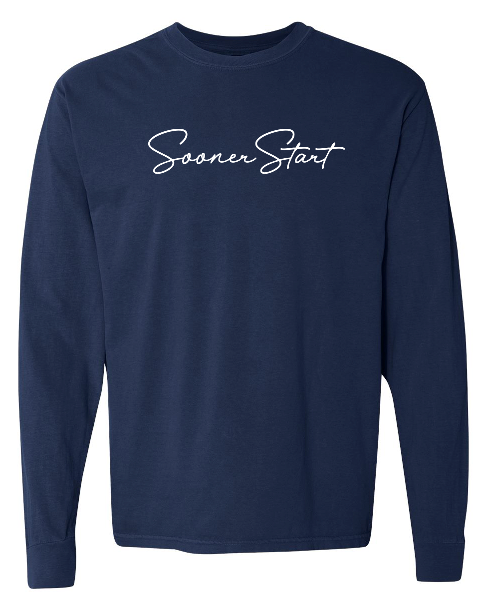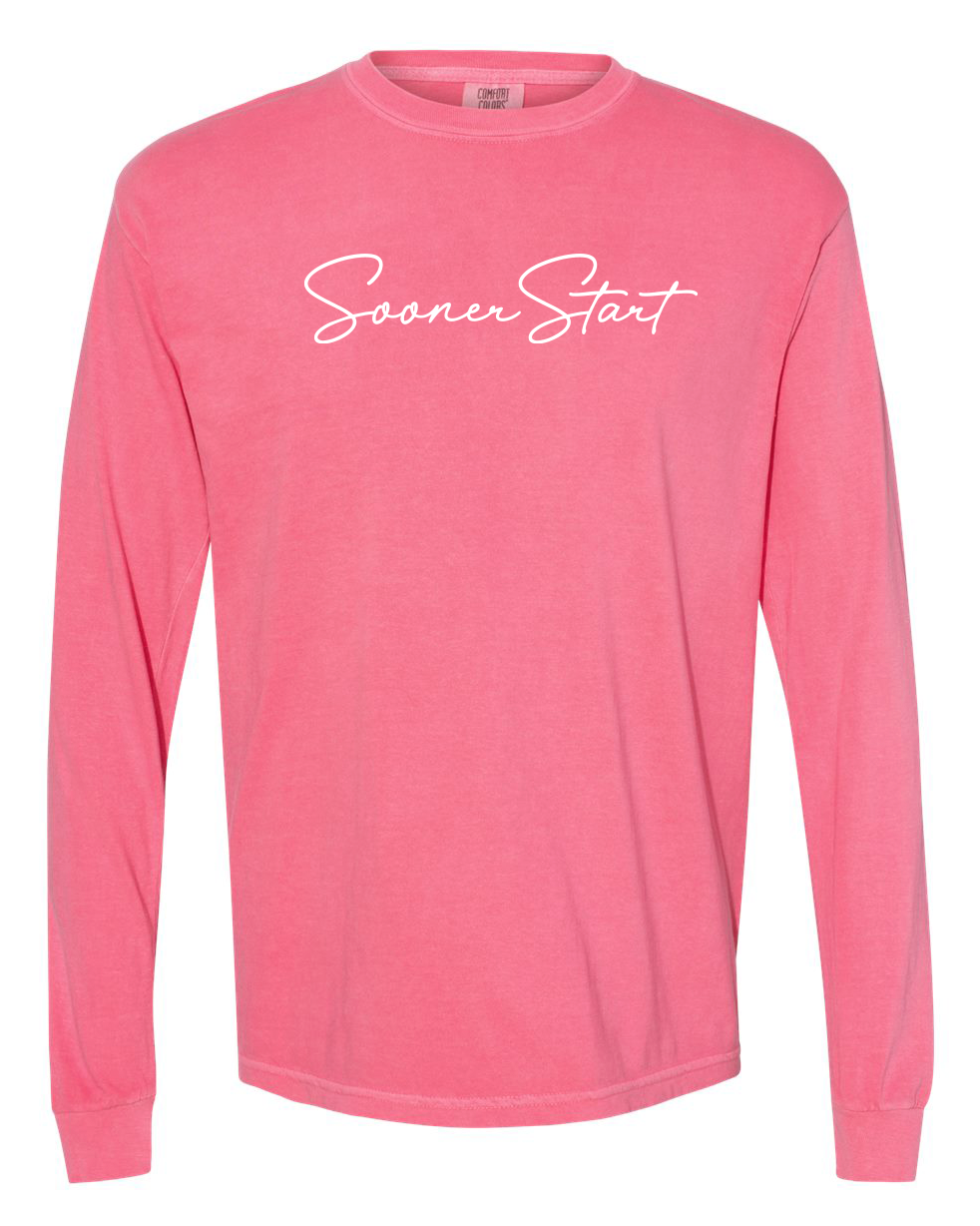 Comfort Colors Unisex Garment-Dyed Heavyweight Long Sleeve T-Shirt with screen printed "SoonerStart" in script font.