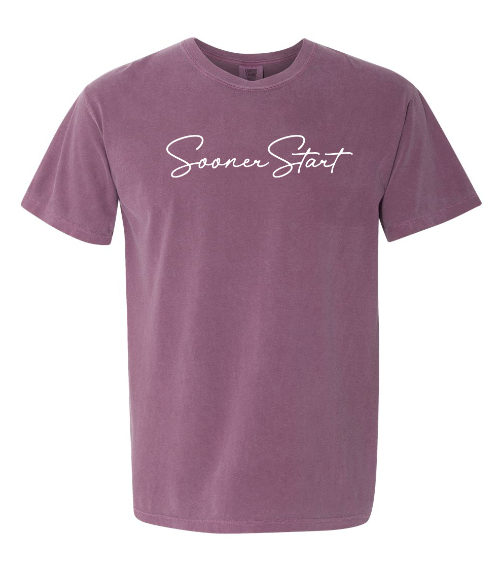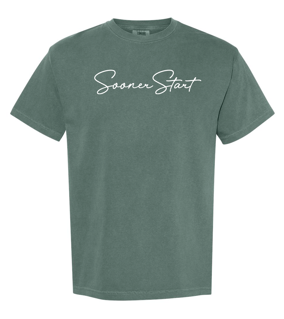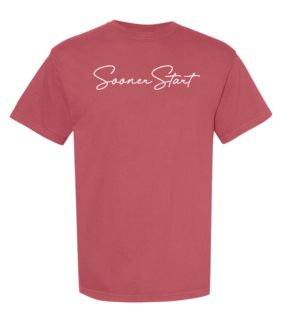 Comfort Colors Unisex Garment-Dyed Heavyweight T-Shirt with screen printed "SoonerStart" in script font.
