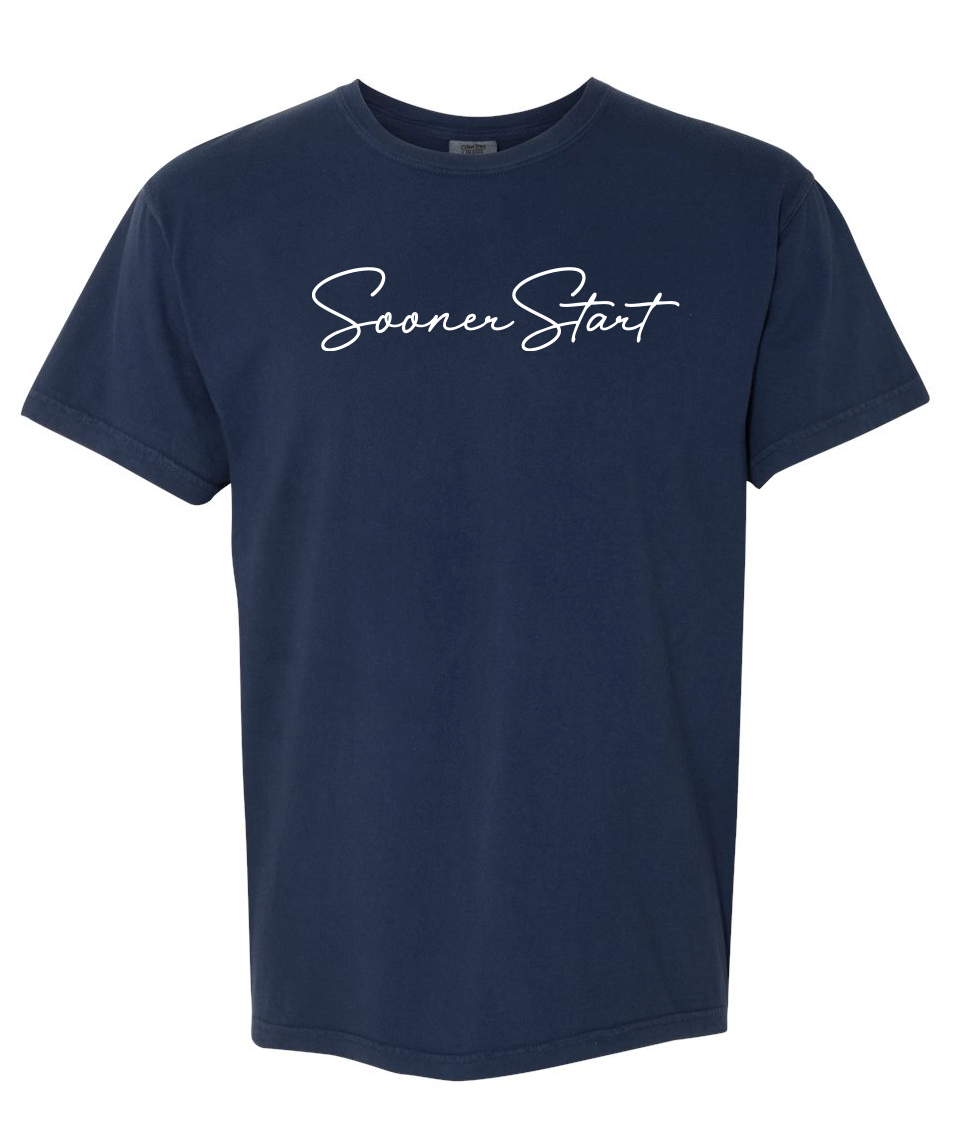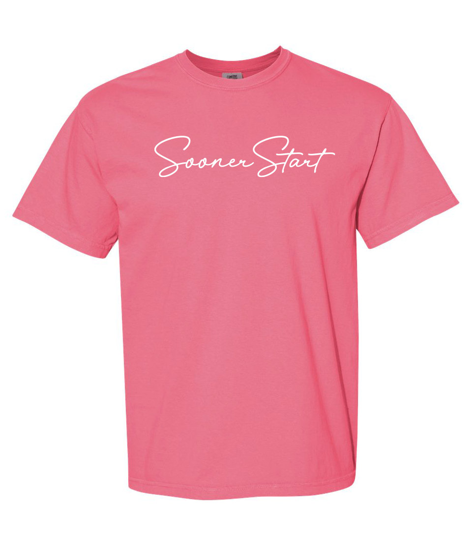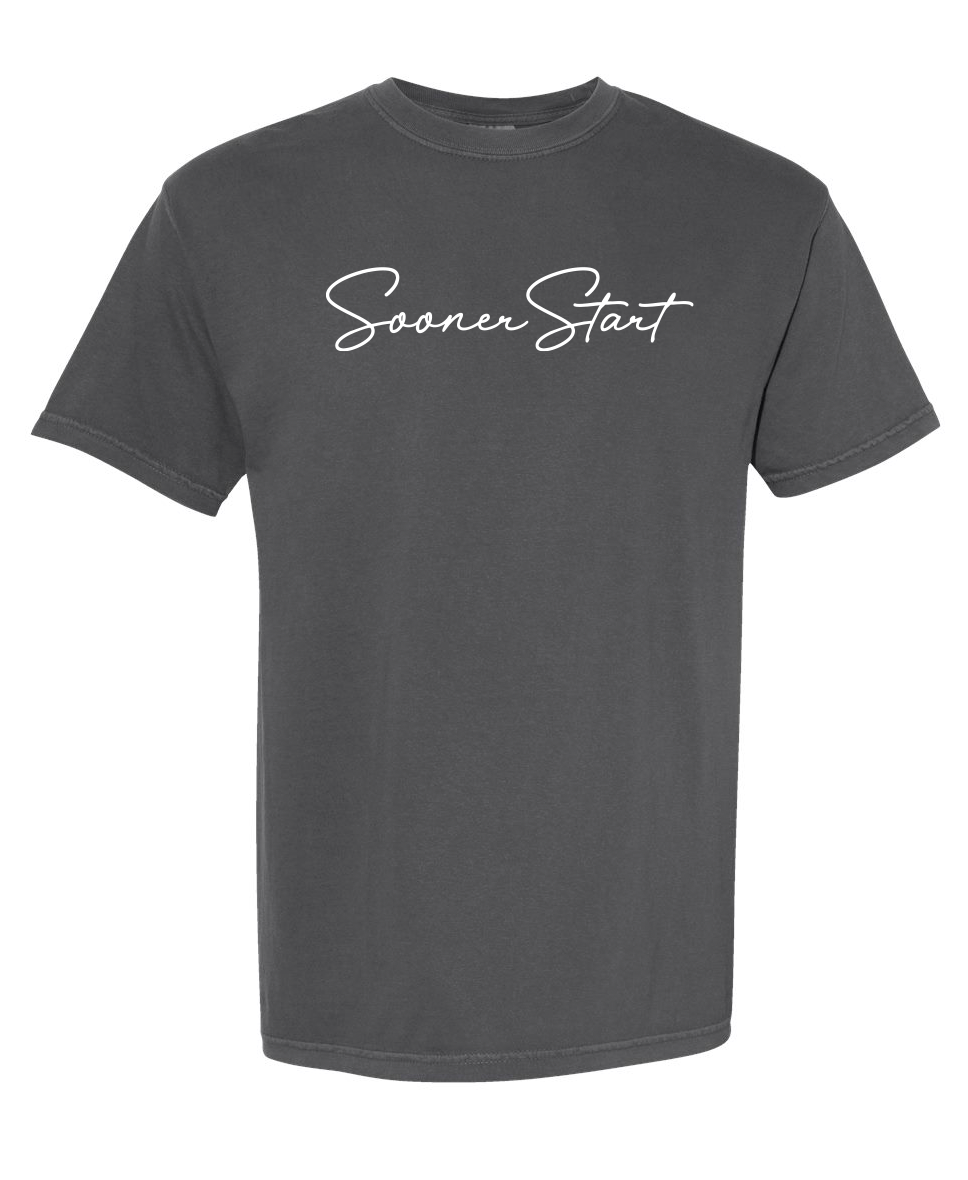 Comfort Colors Unisex Garment-Dyed Heavyweight T-Shirt with screen printed "SoonerStart" in script font.